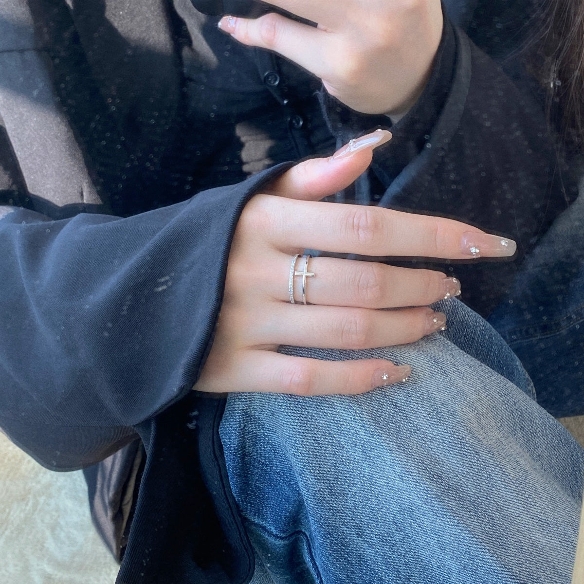 Anillo plata doble cruz + linea con zirconias blancas